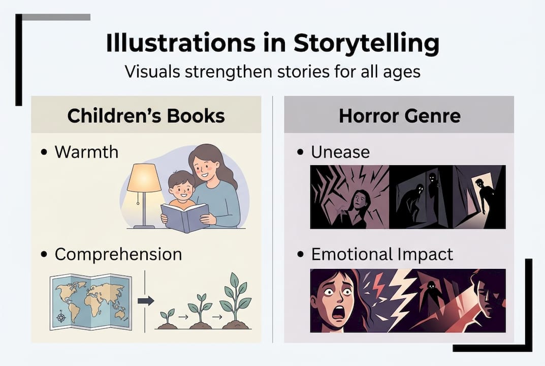 Beyond comprehension, emotional engagement is where illustrations truly earn their place. A child who sees a character's wide, trembling eyes doesn't need the word "scared" spelled out. They feel it. That emotional shortcut is powerful, and it's what makes illustrated book examples in both children's and horror genres so memorable.