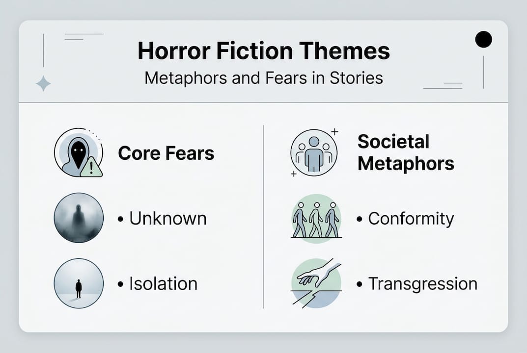 Horror fiction channels specific fears that resonate across cultures and eras. The key themes include fear of the unknown, death, the afterlife, evil, psychological dread, body horror, and social anxieties like isolation, madness, and transgression. These themes function as vessels for exploring what terrifies us individually and collectively, making abstract anxieties concrete through narrative.