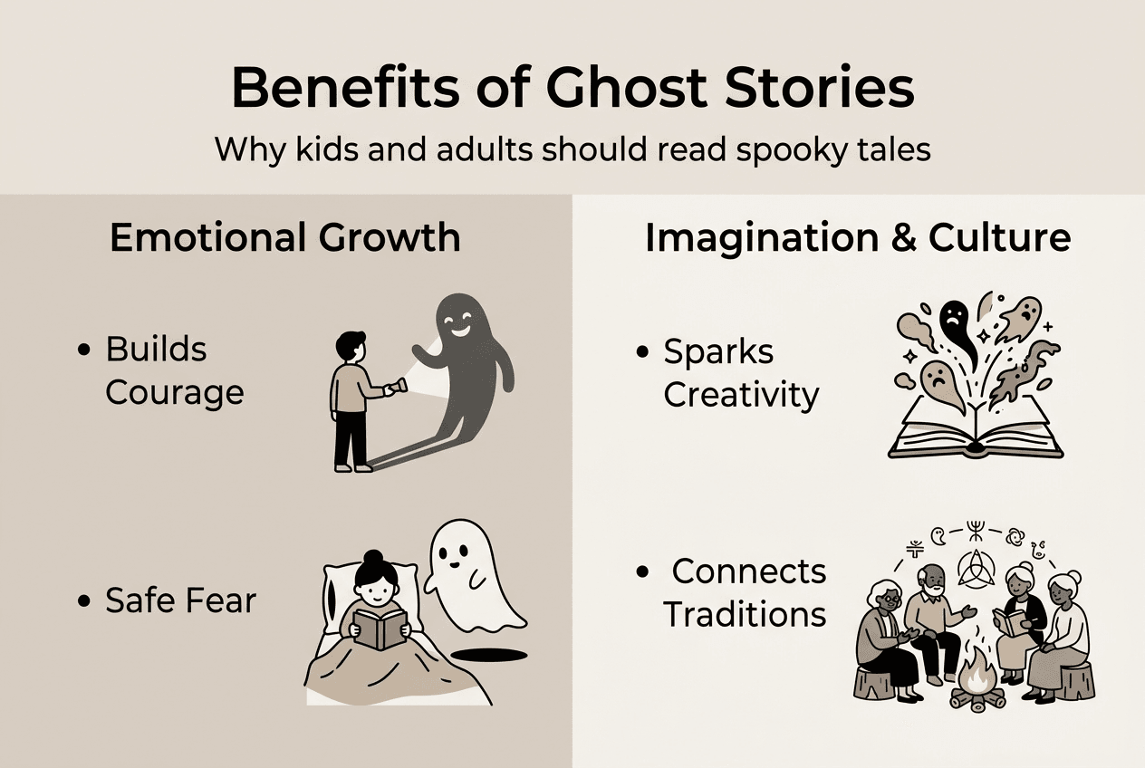 Many people assume ghost stories exist solely to frighten, to deliver quick scares and sleepless nights. Yet these tales offer far more than momentary chills. Ghost stories provide genuine emotional, psychological, and entertainment benefits for readers of all ages, from children discovering courage to adults seeking meaningful suspense. This article explores why reading ghost stories matters, examining their deeper value for emotional growth, cultural connection, and imaginative engagement, plus practical guidance for parents introducing these tales to young readers.